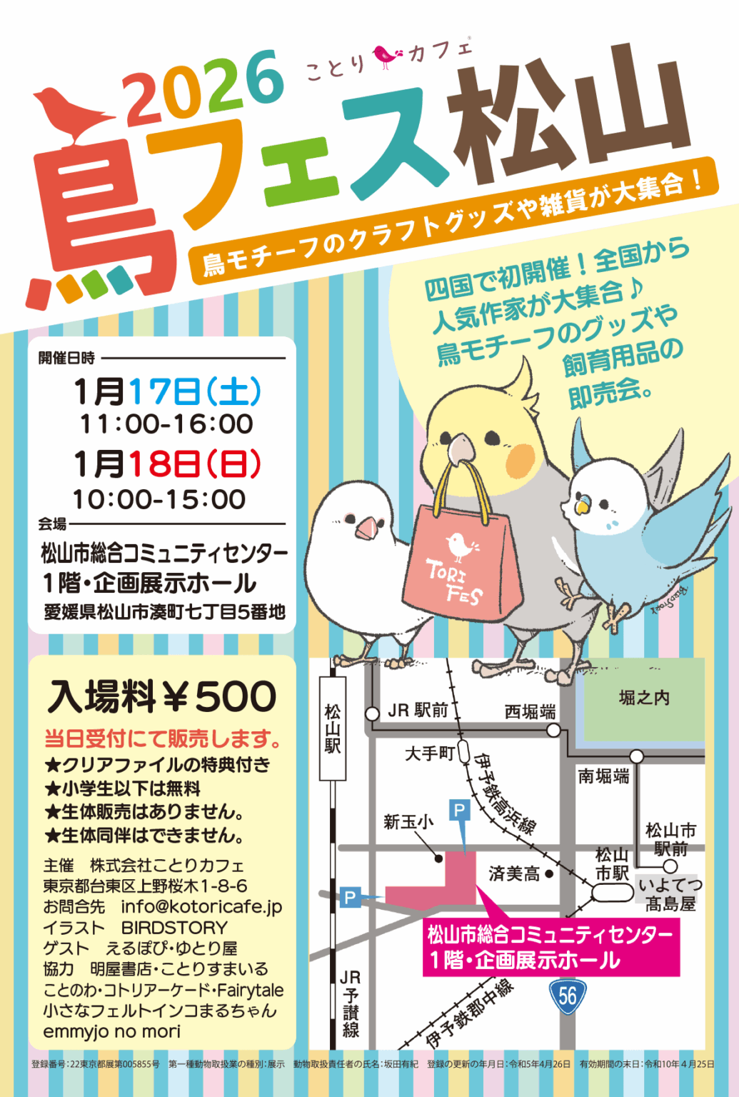 2026年1月17日(土)~2026年1月18日(日)にて愛媛県松山市にて開催される「鳥フェス松山」にて、ことのわ様ご協力のもと「TORIKO」5袋、「Toricker」3個の数量限定となりますが出品させていただくこととなりました!